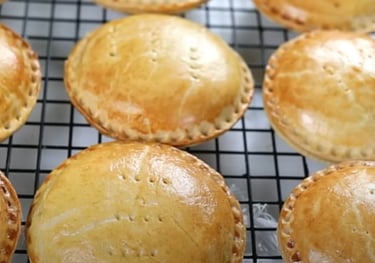 Nigerian meat pie is a popular West African savory pastry, typically crescent-shaped, filled with a flavorful mixture of minced meat (often beef), potatoes, carrots, and spices. The filling is seasoned with herbs and spices like curry powder, thyme, and other spices for a rich, savory flavor.